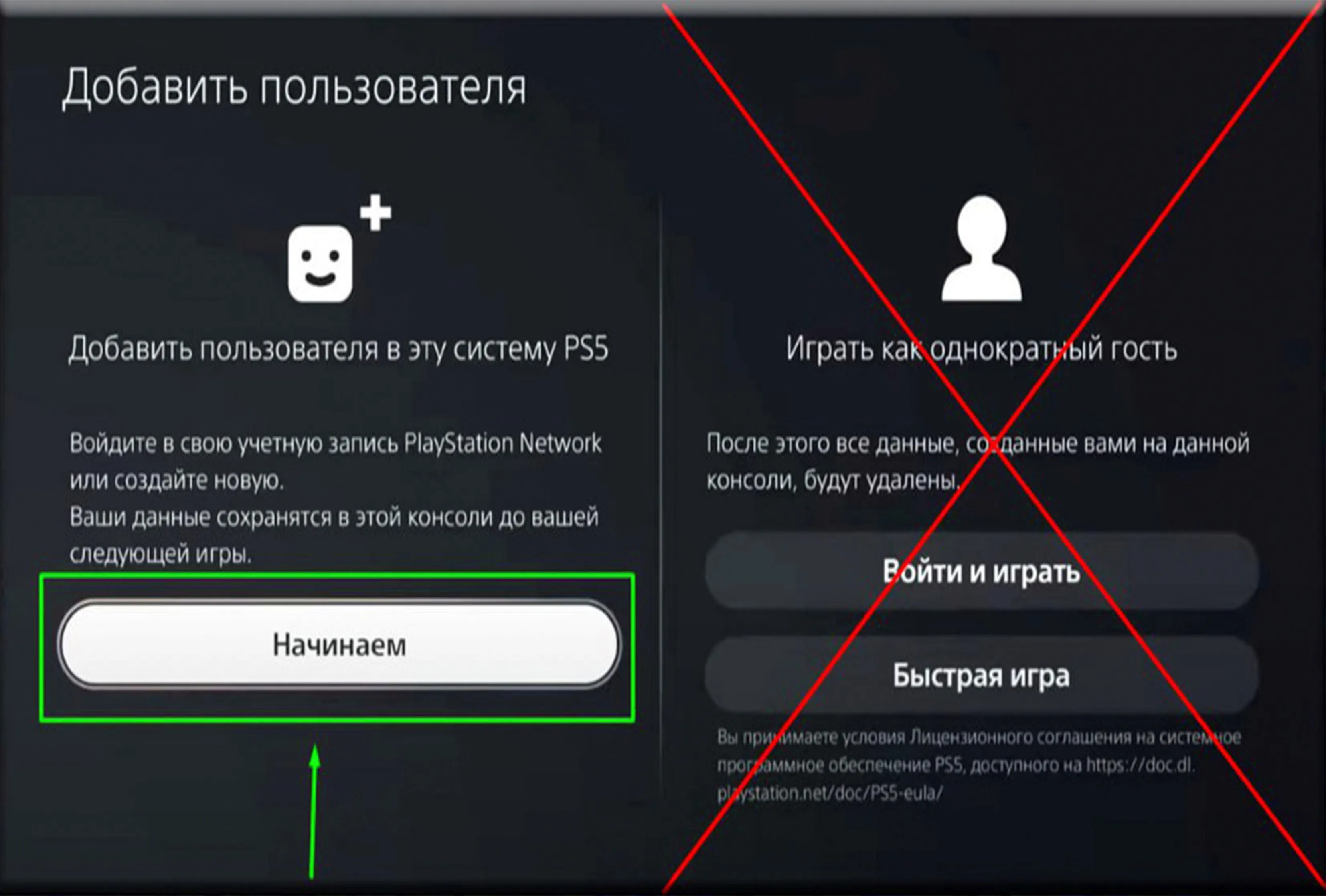 ❖ ВЫБИРАЕМ ➔ «НАЧИНАЕМ» ! (не как гостя!) ➔ «Принимаем лицензионное соглашение»