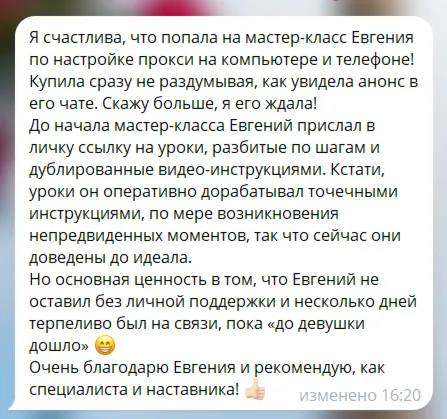 «Добрый день. Я видео не смотрел, мне было достаточно текстового материала. Без проблем купил прокси, настроил Мозилу. Радуюсь. Большое Вам спасибо!»