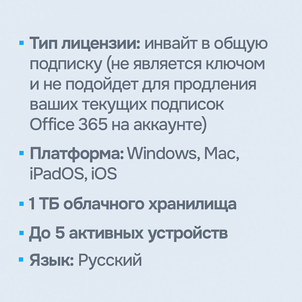 • Тип лицензии: Официальная подписка Office 365 на Вашу личную учётную запись Microsoft